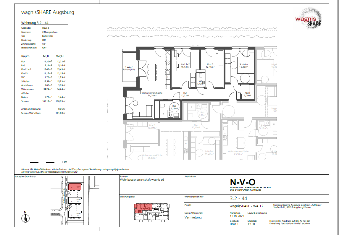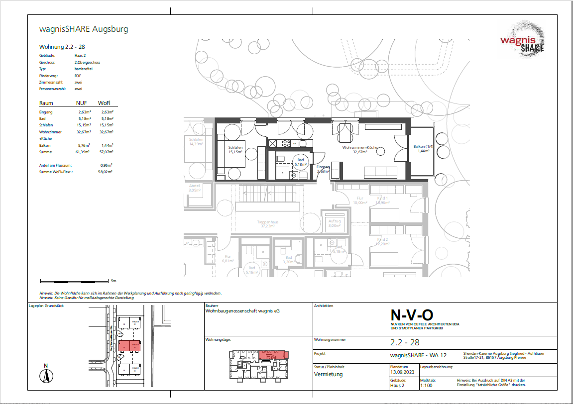 Bis April 2026 wächst im Sheridanpark im Westen Augsburgs unser neuntes Wohnprojekt, wagnisSHARE. Auf dem Baufeld 12 entstehen in einer nachhaltigen und ökologischen Bauweise 46 Wohnungen in 3 Häusern. Ein Mix aus freifinanzierten und geförderten Wohnungen soll für eine bunte, inklusive und generationenübergreifende Nachbarschaft sorgen. Gemeinschaftsflächen wie Gästeapartment, Werkstatt und Dachterrassen entlasten die eigene Wohnung und bieten Raum für Begegnung. In enger Kooperation mit unseren Nachbarn wollen wir im Süden unseres Grundstücks einen Platz schaffen, der sich dem Quartier öffnet und Kontakt und Kommunikation ermöglicht.