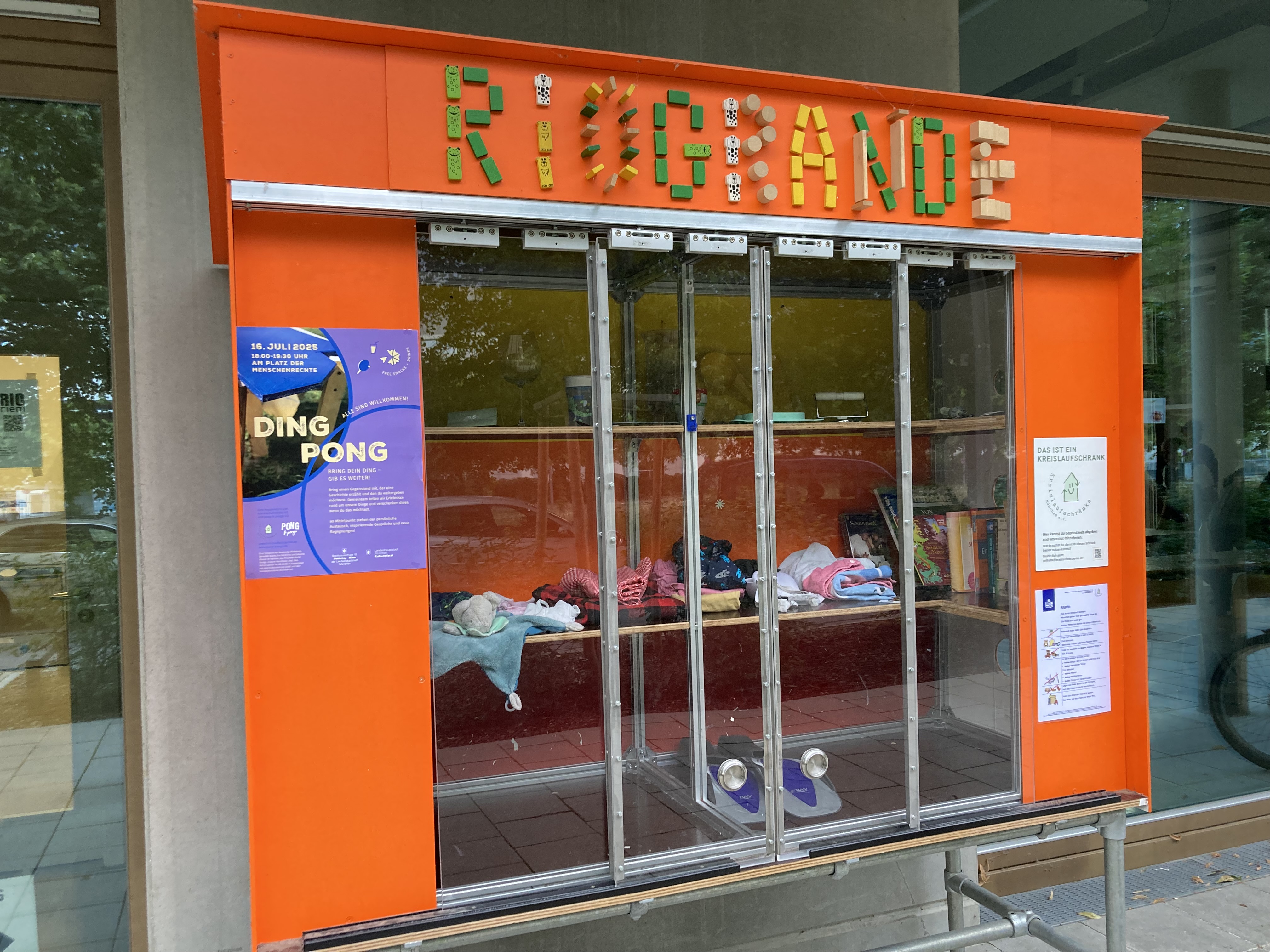 Innovativ ist der Verein auch, was die Weiterentwicklung der Schränke betrifft. Waren die ersten Modelle noch Gartenhäuschen, so geht der Trend inzwischen zu Vitrinenschränken. Einer davon steht vor RIOriem, genannt RIO Grande. Der Vorteil dieses Modells: es ist leichter zugänglich und super pflegearm, erklärt die Vereinsvorsitzende. Denn die Gartenhütten sind auf Dauer weniger robust, darüber hinaus sind sie wenig einsehbar: bei rund 100 Besucher*innen am Tag wichtige Kriterien. Und leider haben die Helfer*innen auch schlechte Erfahrungen mit Vandalismus, Vermüllung und Verschmutzung gemacht.