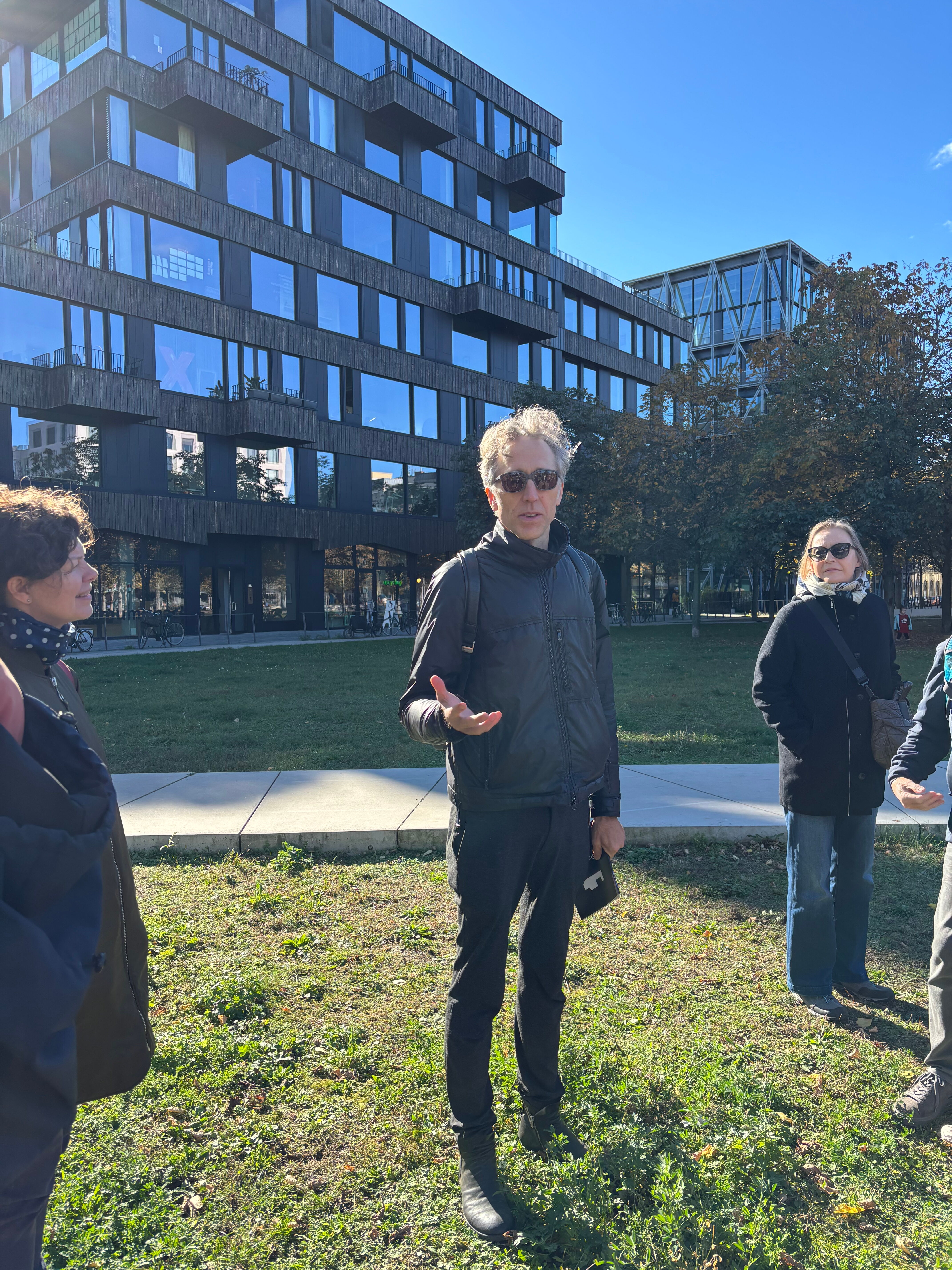 Zum Abschluss der Exkursion am Sonntag war noch einmal die Besichtigung einer Genossenschaft an der Reihe. Vorstand Ansgar Dietrich berichtete von schweren Zeiten, die die Möckernkiez eG durchgemacht hat. Aus einer Initiative von Bürger*innen war 2009 die „Möckernkiez Genossenschaft für selbstverwaltetes, soziales und ökologisches Wohnen eG“ entstanden. Im Jahr darauf kaufte sie das Grundstück am Gleisdreieck-Park für acht Millionen Euro, das Geld hatten die Mitglieder als Eigenmittel selbst gestemmt. Nach dem Baustart stellte sich heraus, dass die Finanzierung auf wackligen Beinen stand. Ein Baustopp war die Folge, das ganze Projekt stand auf der Kippe. Erst ein Jahr später gelang die Rettung, 2016 konnte weitergebaut werden. Die 14 Häuser mit 471 Wohnungen und 22 Gewerbeeinheiten konnten schließlich 2018 bezogen werden. Trotz dieses schwierigen Starts würde auch die Möckernkiez eG gern weiterbauen. „Wir sind auf der Suche nach einem Grundstück“, sagte Ansgar Dietrich. „Es gibt viele Möglichkeiten, ob am Flughafen Tegel, in Tempelhof oder Pankow, aber die Projekte gehen insgesamt nicht richtig vorwärts, und die Genossenschaften werden nicht beteiligt“, beschrieb er die Situation.