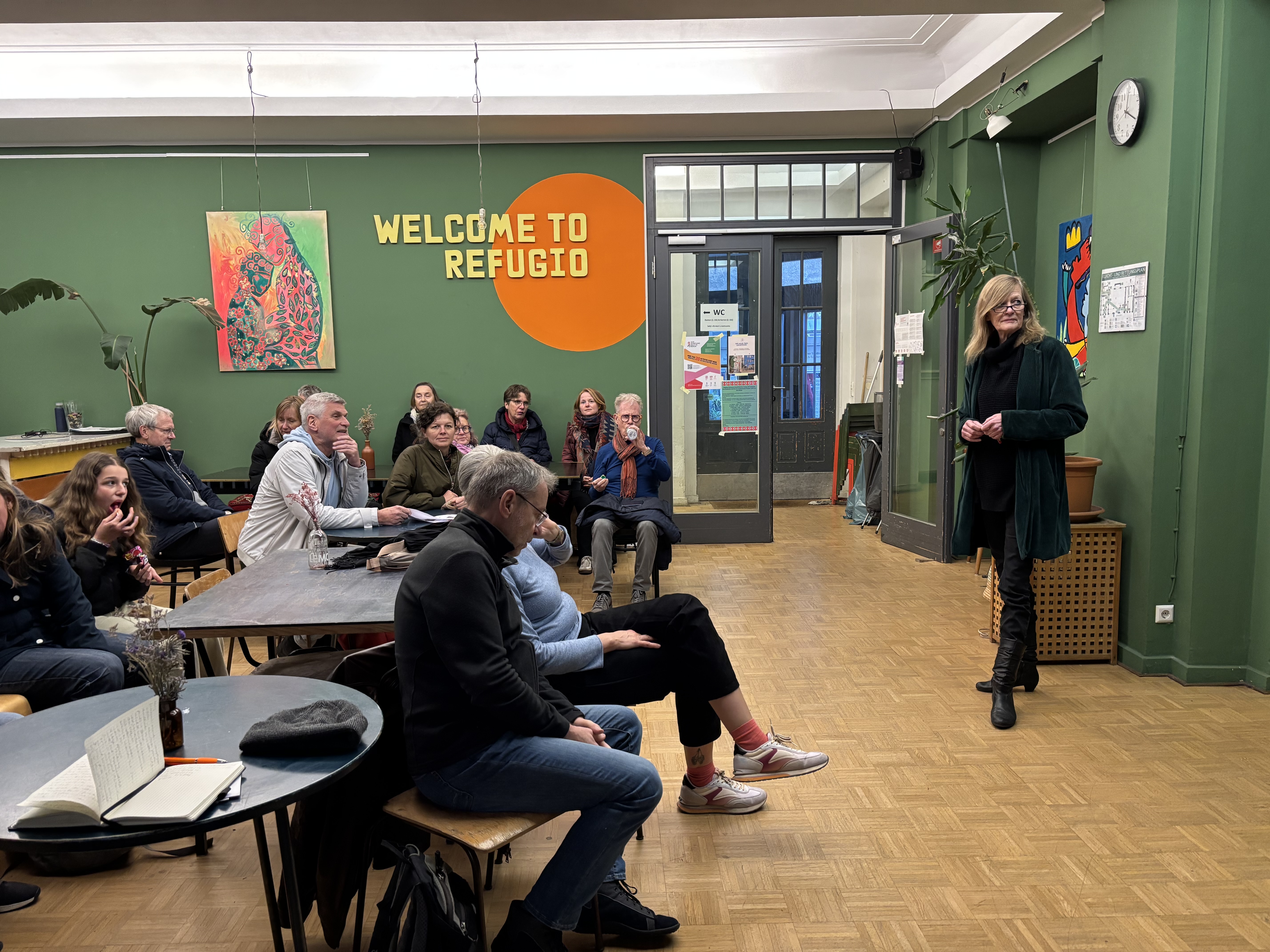 Gedacht seien die Wohnungen für Menschen in Ausbildung, die für einen begrenzten Zeitraum einen Platz brauchen, erklärte Einrichtungsleiterin Anna Pass den Besucher*innen. In der Regel soll die Wohndauer drei Jahre nicht überschreiten. Jede*r Bewohner*in verpflichtet sich, vier Stunden in der Woche ehrenamtlich zu arbeiten. Insgesamt verfügt Refugio über ein großes Netz an Engagierten, die sich zum Beispiel dienstags im Willkommenscafé mit Beratung oder mittwochs im Sprachcafé einbringen. „Wir beschäftigen bewusst keine Sozialarbeiter*innen, sondern die Hilfe kommt aus der Gemeinschaft“, erläuterte Anna Pass. Das Haus erhält übrigens keine öffentliche Förderung, sondern finanziert sich zu einem guten Teil über die Vermietung des großen Veranstaltungssaals im Erdgeschoss. Dazu kommen weitere Einnahmen durch die Vermietung der Ateliers und Wohnungen, auch der Träger, die Berliner Stadtmission, schießt Mittel zu.