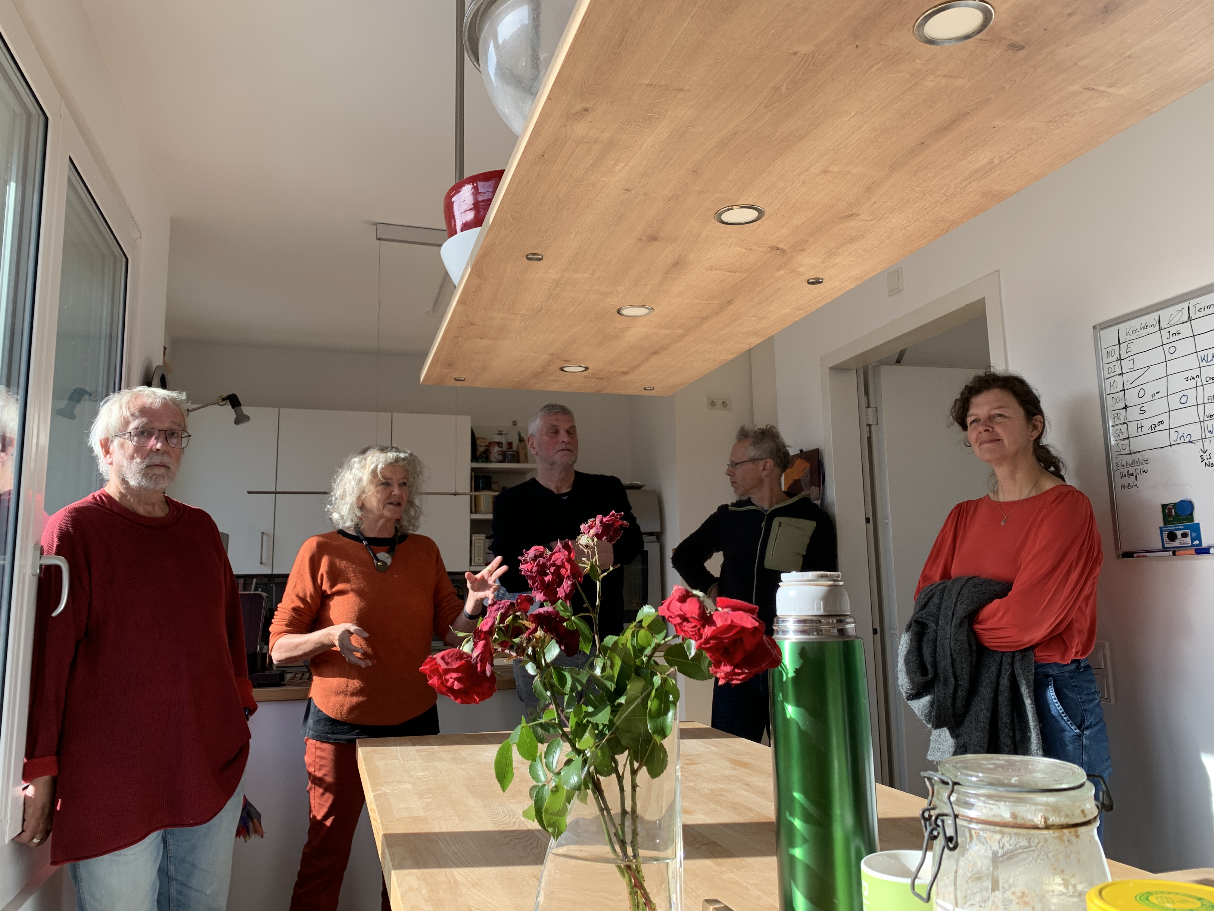 Ein Blick in die Clusterwohnung der WG „Lebendig altern“ rundete das umfangreiche Wochenend-Programm ab. Das Ehepaar Harald Kamps und Ulrike Arnold hatte den Anstoß für die Gründung der WG gegeben, ihr Ziel ist, bis zum Lebensende füreinander da zu sein, quasi ein Gegenentwurf zum Altersheim. Dafür wurde eine GbR gegründet, die von der Möckernkiez eG zwei Clusterwohnungen auf zwei Ebenen gemietet hat. Hier sind sieben Haushalte eingezogen, die Bewohner*innen sind zwischen 60 und 75 Jahre alt. Auch wenn viele von der Idee begeistert sind, so gestaltete sich die Suche nach Mitbewohner*innen doch langwieriger als erwartet, berichteten Harald Kamps und Ulrike Arnold. Die Vorstellung, seine großzügige Altbauwohnung mit Flügel und Tausenden von Büchern aufgeben zu müssen, lässt viele zurückschrecken. Ulrike Arnold findet es schade, dass ihr Konzept so oft mit Reduktion und Verzicht in Verbindung gebracht wird. „Dabei habe ich doch ganz viel Zugewinn“, ist ihre Erfahrung: eine barrierefreie Umgebung, viele soziale Kontakte, gegenseitige Unterstützung, die täglichen gemeinsamen Abendessen, viele Unternehmungen, ein generationenumgreifendes Umfeld und vieles mehr. Eine Erfahrung, die sie mit vielen wohnenden wagnis-Mitgliedern teilt.