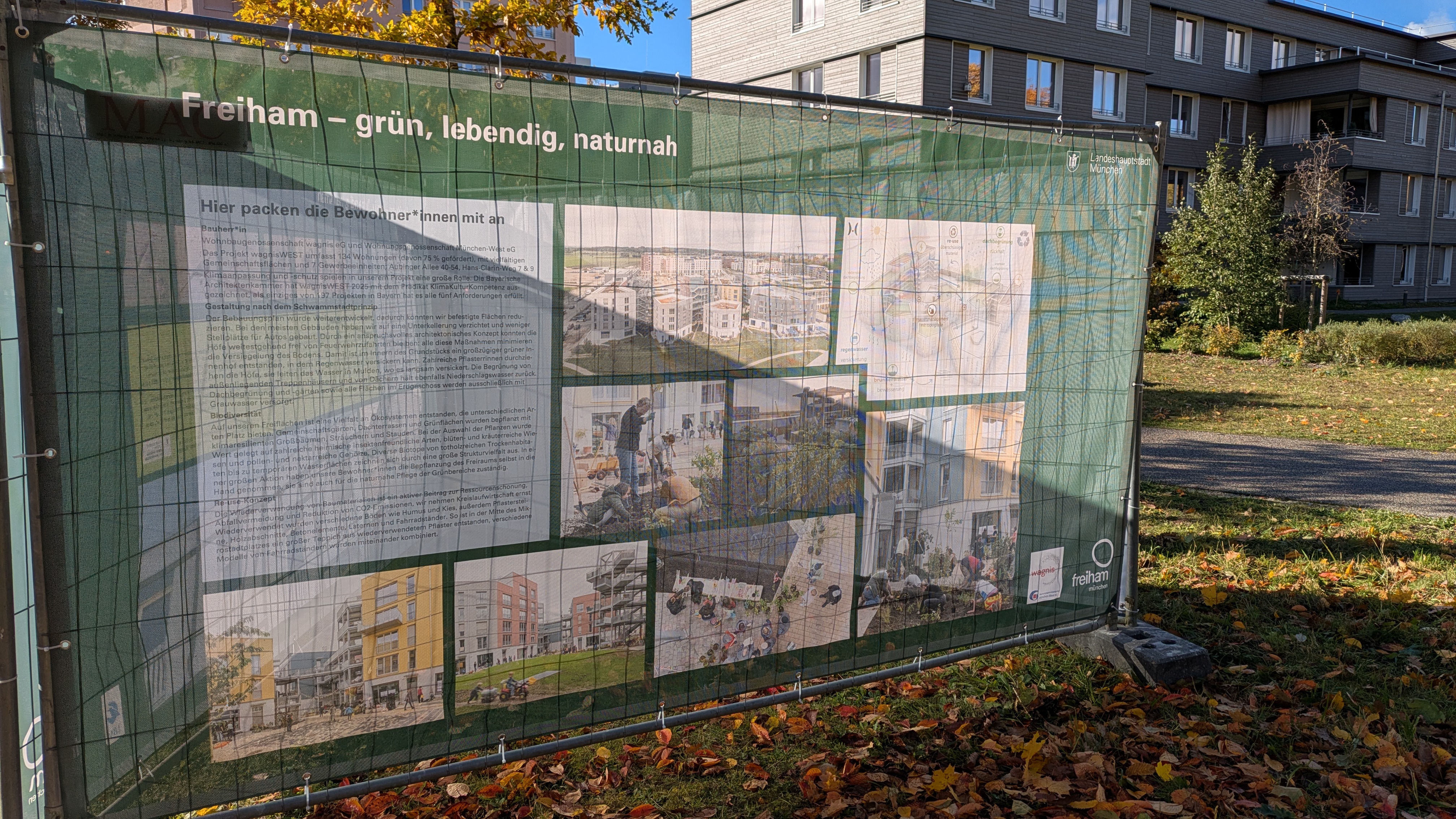 „Freiham – grün, lebendig und naturnah“ ist der Titel einer Freiluft-Ausstellung, die in der vergangenen Woche im Grünband Neuaubing-Freiham eröffnet wurde. Nicht nur viele Menschen haben hier im Stadtviertel im Westen von München eine neue Heimat gefunden, auch für zahlreiche Tiere gibt es Unterschlupfmöglichkeiten. So sind in vielen Fassaden Nisthilfen montiert; begrünte Dächer und Höfe bieten Nahrung und fördern so die Artenvielfalt. Die Gestaltung nach dem Schwammstadtprinzip sorgt dafür, dass das Regenwasser nicht sofort in der Kanalisation verschwindet, sondern langsam in den Grünflächen versickert. Auch das Projekt wagnisWEST ist mit einem Plakat vertreten, auf dem unter anderem das Re-Use-Konzept vorgestellt wird. Die Ausstellung wurde vom MGS-Stadtteilmanagement Freiham im Auftrag des Stadtplanungsreferats organisiert, sie ist noch bis Mitte Januar im Grünzug auf Höhe der Grete-Weil-Straße zu sehen (Fotos Helga Gekle).